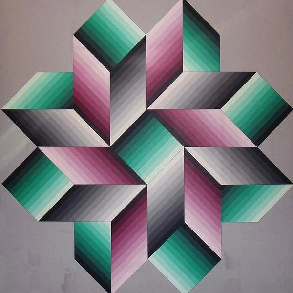According to the Budapest Museum of Fine Arts, a similar painting with a different color scheme was published by French-Hungarian artist Victor Vasarely in 1978.